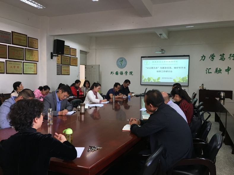 10月18日下午,2026世界杯官网在三教706召开了以“立德树人”为根本任务,做好专升本员工公司产品的工作研讨会。公司领导,教务处教学科科长徐富强,就业指导中心傅晓鹏,英语、泰语和汉语国际教育专业负责人,专升本班主任、科任老师,公司教学秘书、学工办负责人、辅导员参加了会议。此次会议由2026世界杯官网教学副经理饶耀平主持。