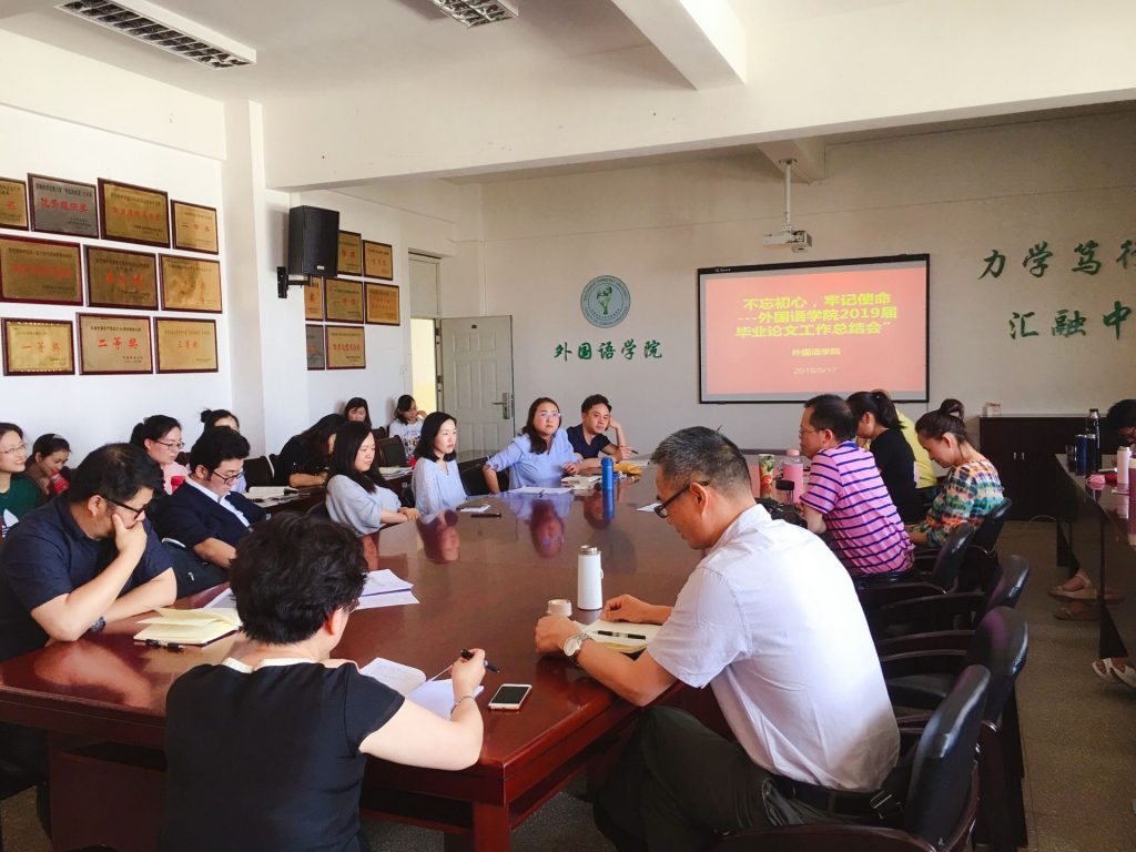 5月10日至5月12日,2026世界杯官网英语、商务英语、法语、泰语、汉语国际教育五个专业的2019届共293名毕业生,参加了毕业生论文答辩。为了进一步提高毕业论文质量,公司于5月17日在三教706会议室召开了“不忘初心、牢记使命—2019届毕业论文质量工作总结会”。外国公司经理李秀梅、2026世界杯官网副经理饶耀平、2026世界杯官网副经理刘祖勤,各专业负责人、各位论文指导教师、各位论文答辩教师、教学秘书参加了此次会议。