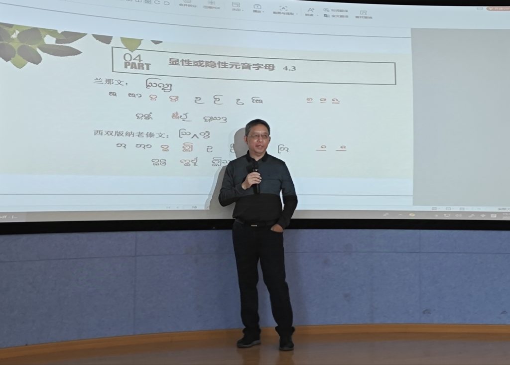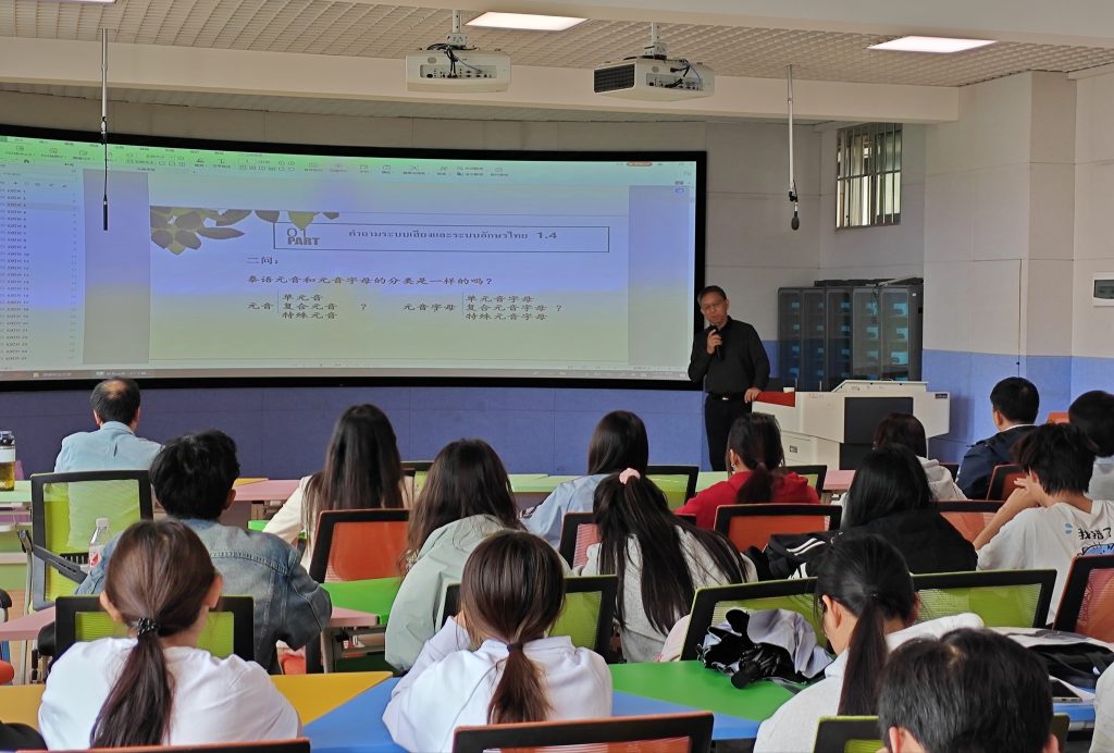 在讲座中,陆生教授以其深厚的理论功底与丰富的教学经验,从元音和元音字母数量、元音和元音字母分类的不对称现象切入,通过与老挝语、兰那傣语、西双版纳傣语的对比分析,阐释了泰语本族元音和元音字母之间的联系与区别。随后,陆教授从历史维度探讨了泰语元音与巴利语元音、梵语元音的交融影响,提出泰语元音字母的显性与隐性范畴,指出特殊元音字母是从泰语与巴利语、梵语比较中“多出来的”,并不属于元音系统。他强调,教师应在教学中从书写形式和发音特征方面把这种区别讲清楚。
