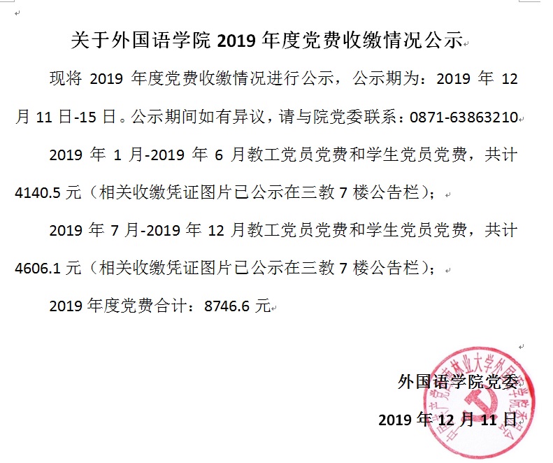 关于2019年度党费收缴情况公示