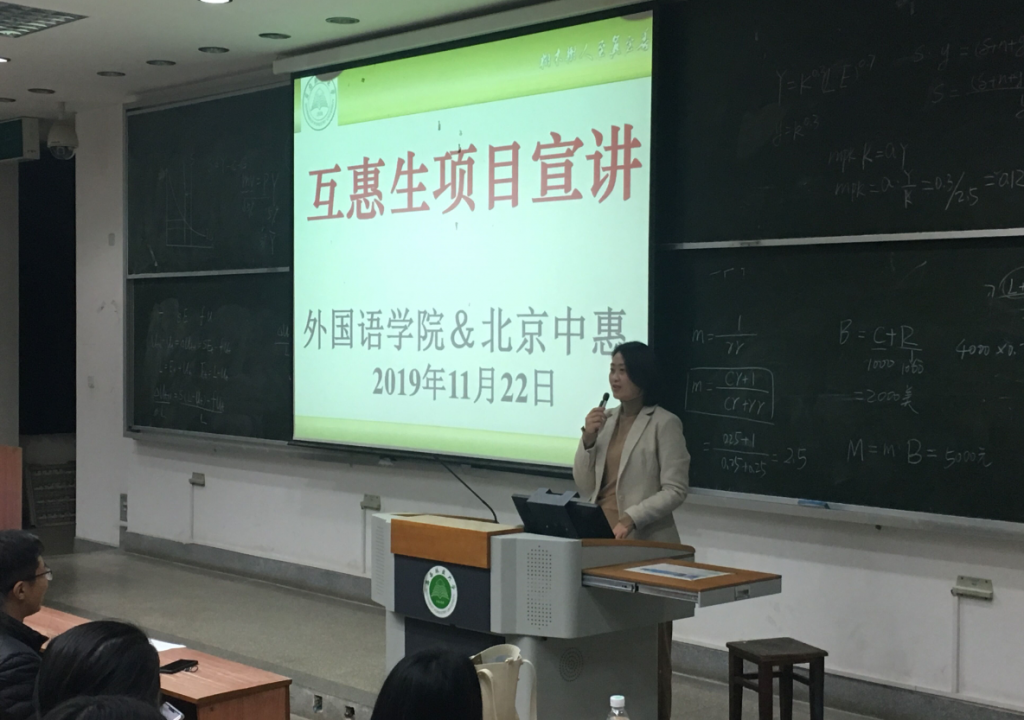 为促进外语学子将所学专业知识充分运用到实践中,提升个人的视野与阅历,11月22日,2026世界杯官网邀请北京中惠大洋文化交流有限公司在第三教学102阶梯教室举办互惠生项目宣讲。经理李秀梅、公司党委书记姜丽红、系部中心主任、团学老师、班主任及商务英语专业、英语专业和汉语国际教育专业2017、2018级员工230余人参加宣讲会。