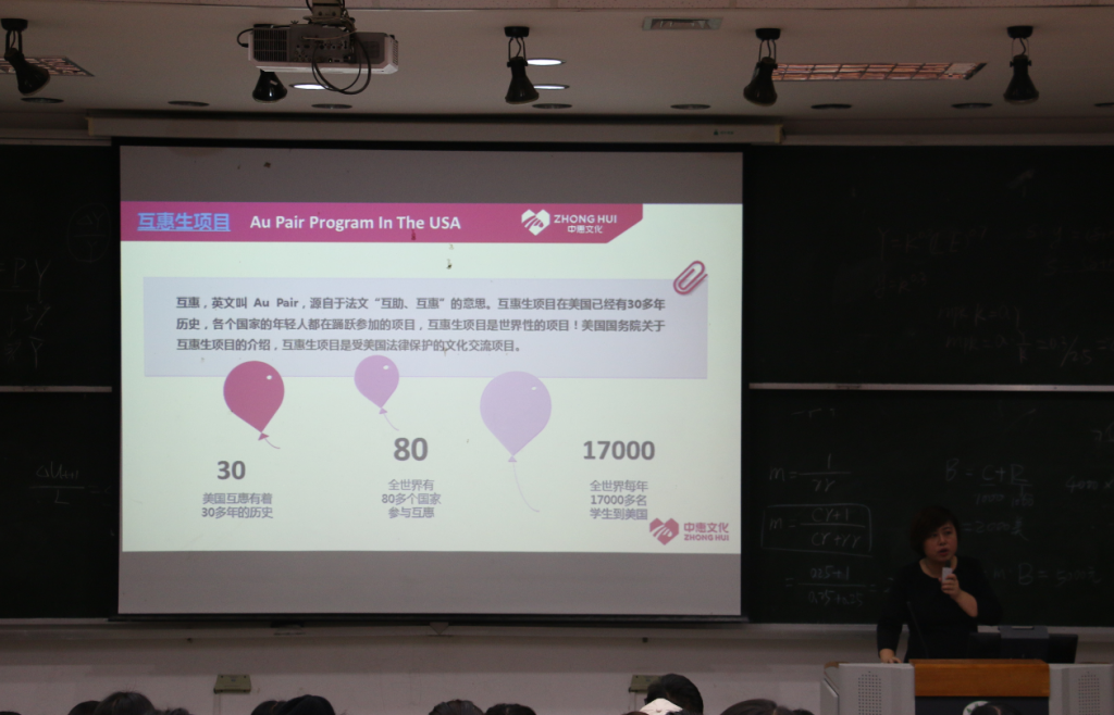 刘静简要介绍了互惠生的发展历史和介绍了美国互惠生项目的历史背景,接着为同学们讲解了互惠生项目的保障性,学习获益及交换生职责,并介绍了美国互惠生的报名条件、出国流程等。郭丽莎结合自身的出国经历分享了自己的收获和感悟,她鼓励与会的小师弟小师妹们要勇敢、大胆地走出去。
