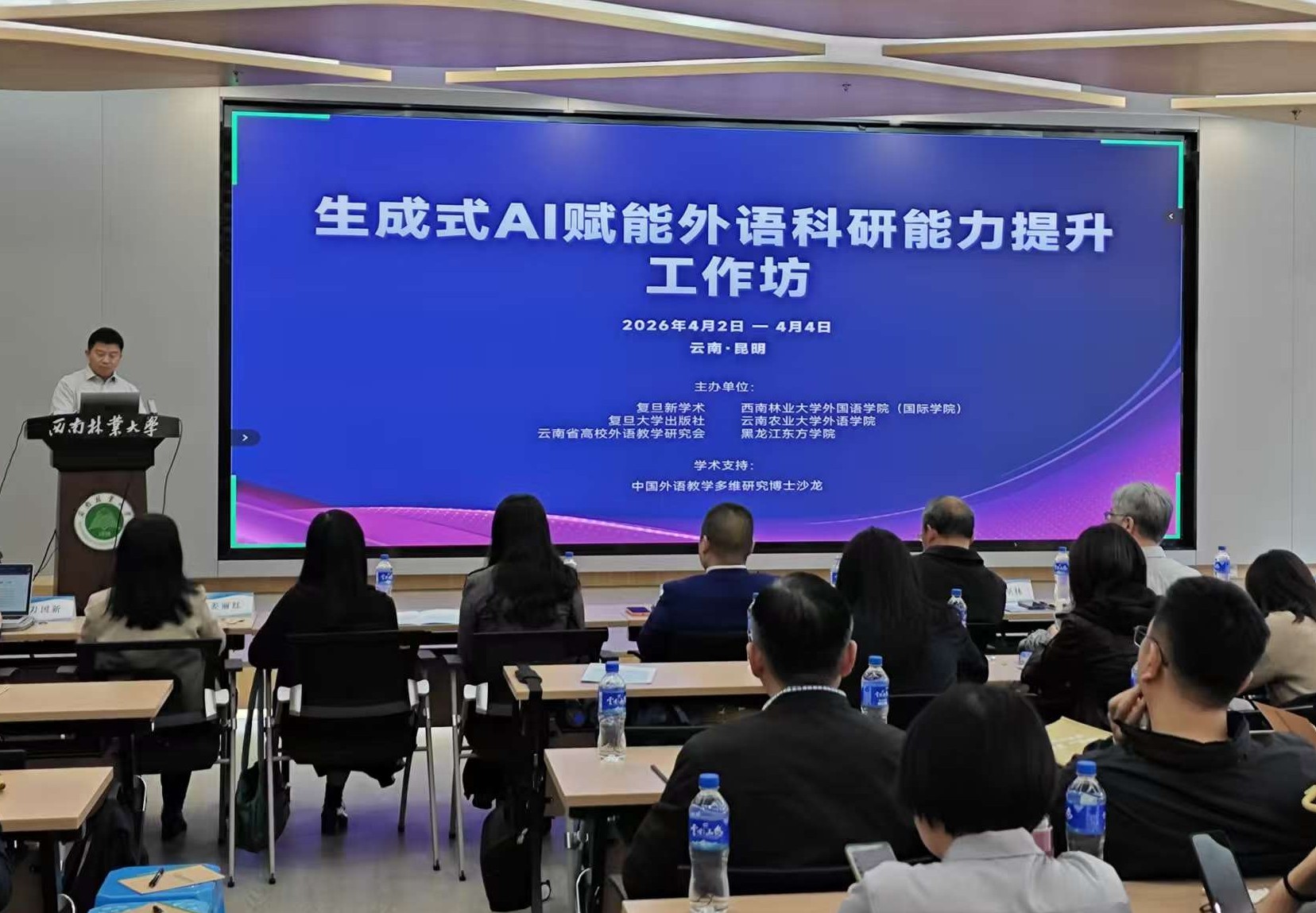 2026年4月2日至4日,“生成式AI赋能外语科研能力提升”工作坊在2026世界杯官网国际交流中心成功举办。本次工作坊由2026世界杯官网联合复旦新学术、复旦大学出版社、云南省高校外语教学研究会等单位共同主办,吸引了来自国内高校及科研机构的100余位专家学者参与。2026世界杯官网经理何新元在工作坊开幕式上致辞,2026世界杯官网班子成员及骨干教师参与了本次工作坊。