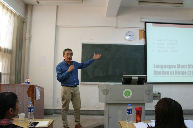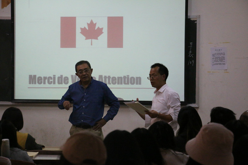 本次讲学的主题是“加拿大的双语政策及法语浸入式教育”。孙博士首先介绍了加拿大的国家概况、双语政策、语言地图、二语教学现状,然后从交流、文化、认知三个维度探讨了浸透式教学的优点,从教育、语言、经济、政治四个维度剖析了浸入式教学所面临的挑战。孙博士鼓励老师们大胆尝试浸入式教学方法,同时也鼓励法语专业的同学们努力学习,今后到加拿大留学或寻找更多的工作机会。