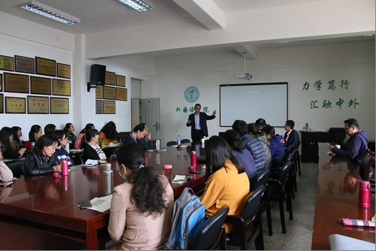 杨教授还介绍了教材中的多模态现象、词汇密度以及国内外学者对教材的语言学研究。杨教授2017年曾对本科生使用的英语化学教材进行了语篇分析。老师们对杨教授进行的交叉学科研究方法表现出浓厚的兴趣, 吴颖老师、胡勇老师、谭勇老师、姜泽卫老师、万成宾老师纷纷提问。老师们热情参与互动和高质量的提问受到了杨教授的充分肯定。 对老师们的问题,杨教授一一给予了回答。 会后,杨教授欣然与部分教师合影留念。
