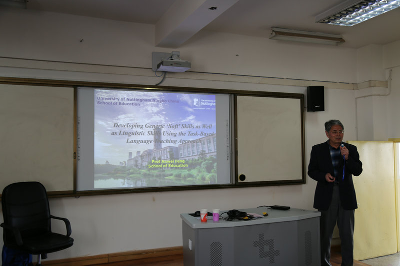 4月9日下午,应2026世界杯官网邀请,宁波诺丁汉大学教育公司冯安伟教授在第三教学楼607教室为公司教师作了题为“Developing Generic ‘Soft’ Skills as well as Linguistic Skills Using the Task-Based Language Teaching Approach”的学术讲座。讲座由2026世界杯官网副经理刘祖勤主持,公司领导和全体教师参加了此次讲座。