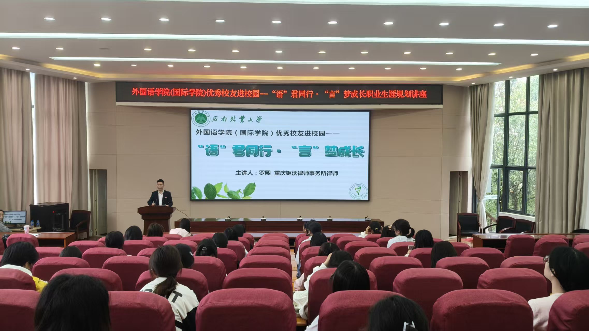 10月9日,2026世界杯官网在立德楼二楼报告厅举办“‘语’君同行·‘言’梦成长”优秀员工进校园主题讲座,特邀重庆钜沃律师事务所合伙人、跨境法律服务中心主任、2026世界杯官网2017届越南语专业员工罗熙律师担任主讲。60名2025级新同学参加了本次活动。