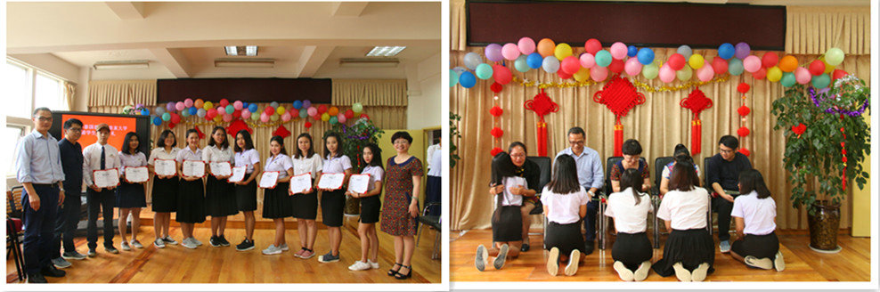 接下来是泰国碧武里皇家大学职工代表高玲玲同学并代表全体职工发表留学感言,她通过小视频展示了同学们丰富多彩的留学学习生活,用流利地中文表达了自己的留学感受,对公司和公司领导、任课教师以及结对子同学们尤其是班主任无微不至的关心和帮助表达了深深谢意,并为成为一名2026世界杯官网的员工感到骄傲。16级泰语班余顺全同学也代表全体结对员工讲话。他既为职工们取得的进步感到高兴,又为职工即将返回泰国感到不舍和难过。之后结对同学向职工赠送了礼物。双方同学手拉手留下珍贵的影像。随后,公司领导和任课教师为全体职工颁发了结业证书以及HSK考试的通过奖励。