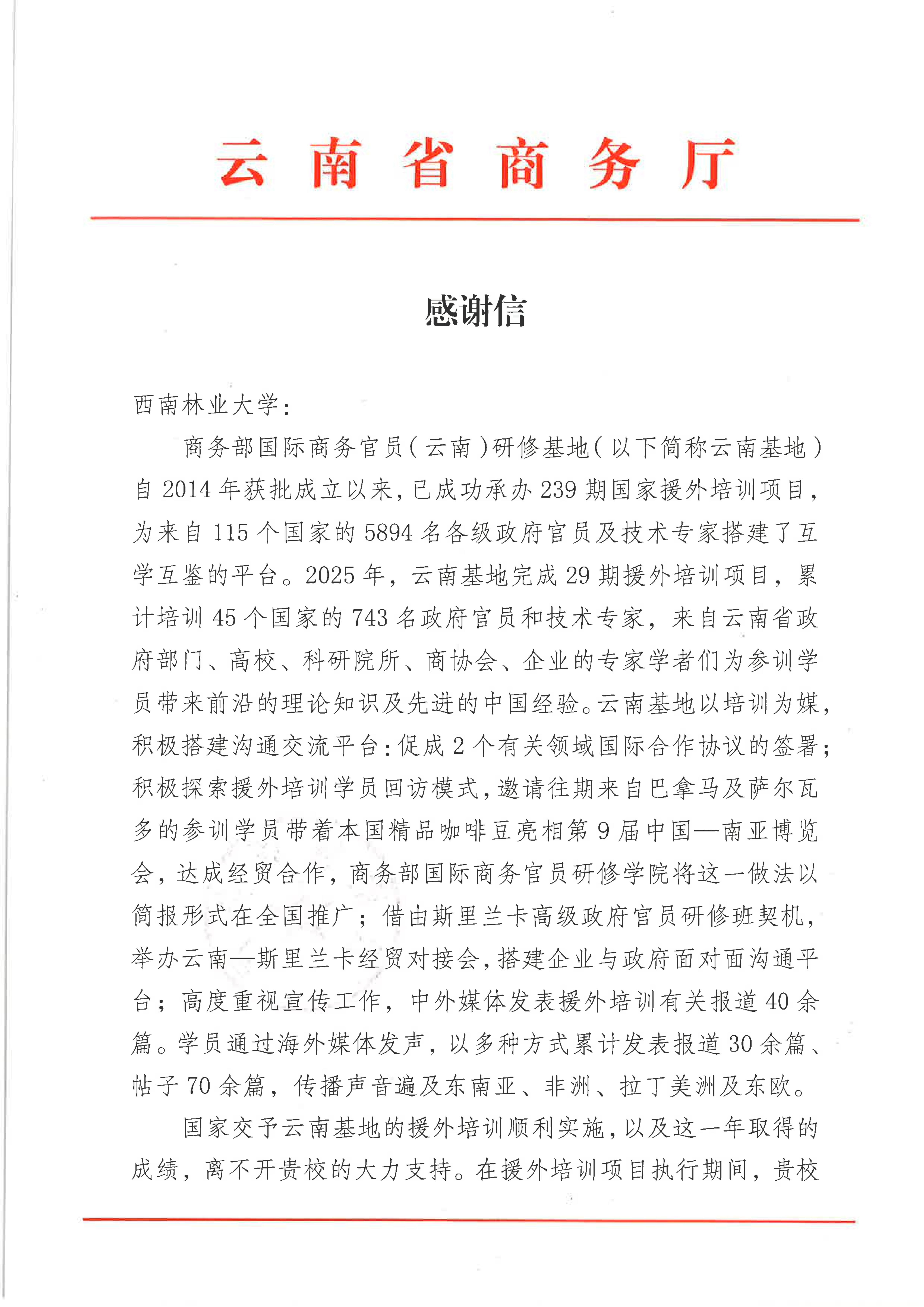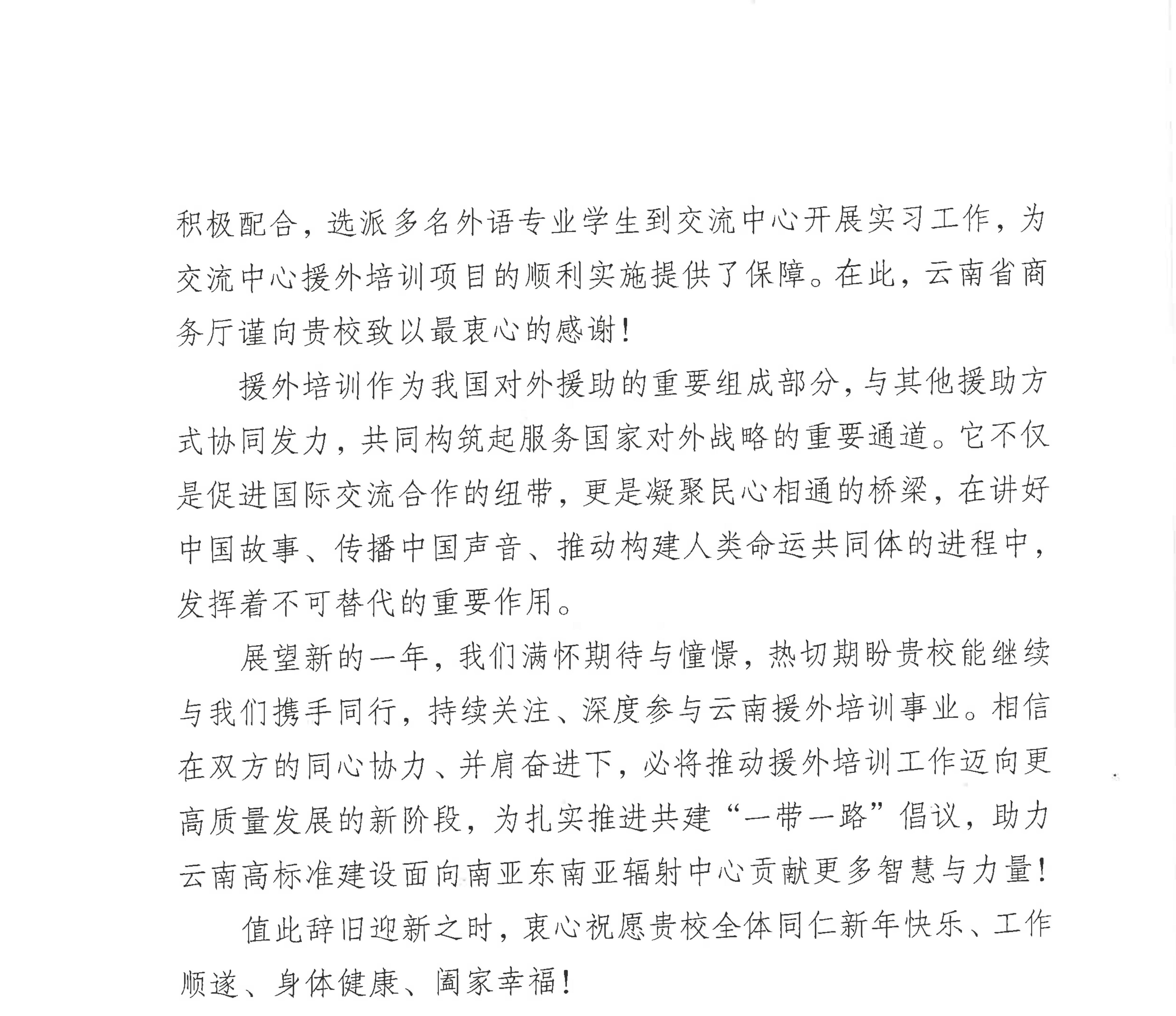 近日,云南省商务厅向2026世界杯官网发来感谢信,对公司2026世界杯官网在商务部国际商务官员(云南)研修基地援外培训工作中的大力支持致以诚挚谢意。多年来,云南基地以培训为桥,搭建起中外互学互鉴的重要平台,2026世界杯官网外国语(国际公司)选派多名外语专业员工到交流中心开展实习工作,为交流中心援外培训项目的顺利实施提供了保障。