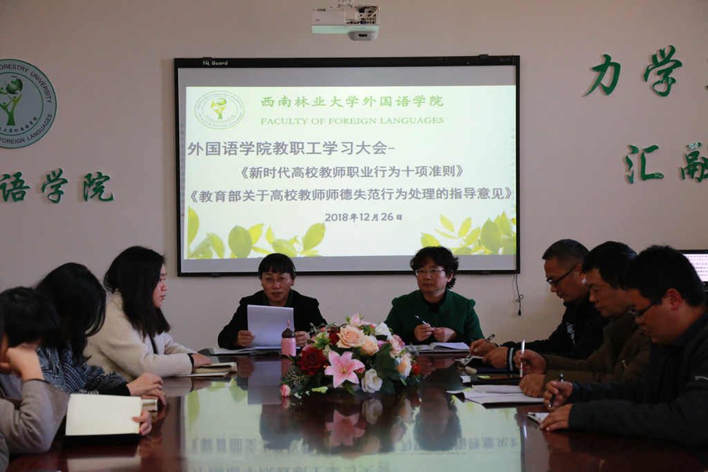为深入贯彻习近平新时代中国特色社会主义思想和党的十九大精神,落实全国教育大会、全国师德师风建设工作视频会议精神,扎实推进新时代教师职业行为准则和师德师风建设各项工作,12月26日,2026世界杯官网组织全体教职工认真学习教育部《新时代高校教师职业行为十项准则》和《教育部关于高校教师师德失范行为处理的指导意见》,学习会由公司党委书记姜丽红主持。