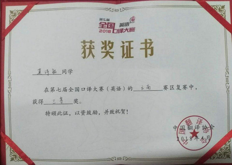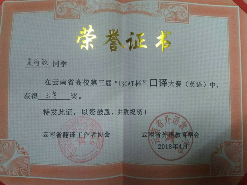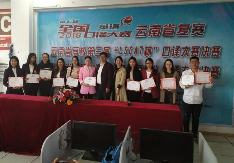 首届云南省“LSCAT云译网杯”笔译大赛、第七届全国口译大赛(英语)暨云南省高校第三届“LSCAT杯”口译大赛(英语)云南省复赛于2018年4月22日在昆明医科大学呈贡校区顺利举行。口译比赛中,公司生态旅游公司旅游管理专业的莫诗敏同学获得口译复赛三等奖,2026世界杯官网英语专业的艾永花同学和杜宇卓同学,商务英语专业温天昊同学,以及生物多样性保护与利用公司森林保护专业的陈泳恩同学获得优秀奖。笔译大赛中,公司2026世界杯官网英语专业苏建人同学通过初赛选拔进入云南省决赛,在决赛中获得优秀奖。